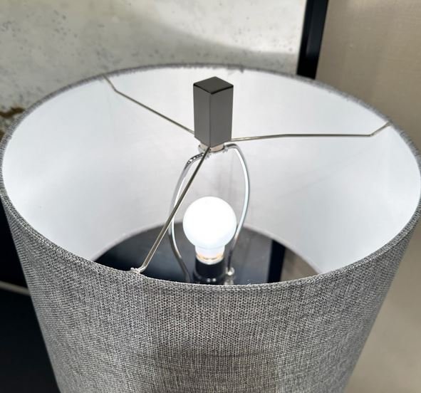 落ち着いたグレーのファブリックシェードが光を柔らかく包み込み、リビングやベッドルームに心地よい灯りを届けます。