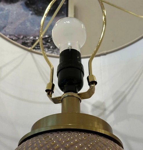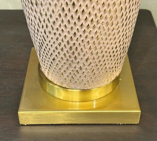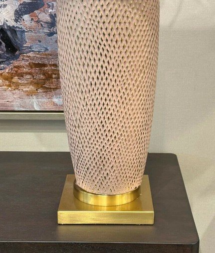温かみのあるピンクカラーをベースに、繊細なテクスチャー模様を施したテーブルランプ。