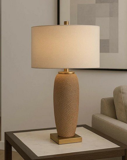 シンプルなファブリックシェードと重厚感のあるメタルベースの組み合わせが、上質で洗練された印象を演出します。