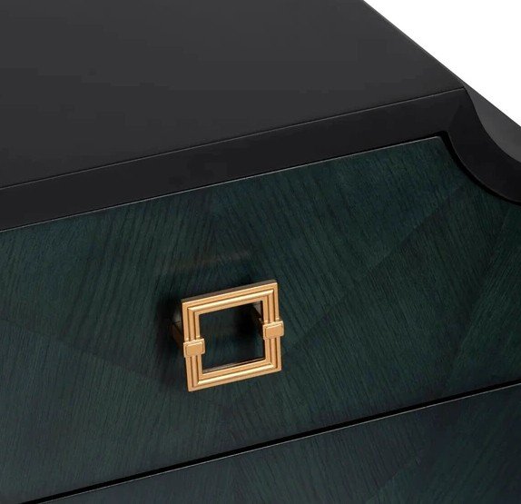 深みのあるエメラルドグリーンの木目が美しい、モダンなデザインの3段チェストです。